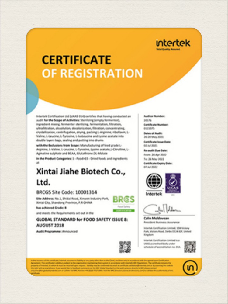 汕頭佳禾生物科技有限公司是一家致力于氨基酸及其衍生物研發(fā)、生產(chǎn)和銷售的國(guó)家高新技術(shù)企業(yè),先后通過了國(guó)家藥品GMP認(rèn)證,ISO9001質(zhì)量體系認(rèn)證、ISO14001環(huán)境管理體系認(rèn)證。目前,公司擁有“廣東省專精特新中小企業(yè)”、“廣東省氨基酸產(chǎn)品工程技術(shù)研究中心”、“汕頭市生物發(fā)酵工程技術(shù)研究開發(fā)中心”、“汕頭市知識(shí)產(chǎn)權(quán)優(yōu)勢(shì)企業(yè)”、“多項(xiàng)國(guó)家發(fā)明專利”、“廣東省守合同重信用企業(yè)”等多項(xiàng)資質(zhì)和榮譽(yù),旗下“佳禾牌”系列產(chǎn)品已成為原料藥行業(yè)知名品牌。 新泰市佳禾生物科技有限公司成立于2012年8月,注冊(cè)資金2億元,公司位于山東泰安新泰市新汶工業(yè)園區(qū),是國(guó) 家級(jí)高新技術(shù)企業(yè)、山東省“專精特新”企業(yè)、山東省制造業(yè)單項(xiàng)冠軍企業(yè)、泰安市科技型中小企業(yè)、泰安市農(nóng)業(yè)產(chǎn)業(yè)化龍頭企業(yè)、中國(guó)生物發(fā)酵產(chǎn)業(yè)協(xié)會(huì)理事單位。